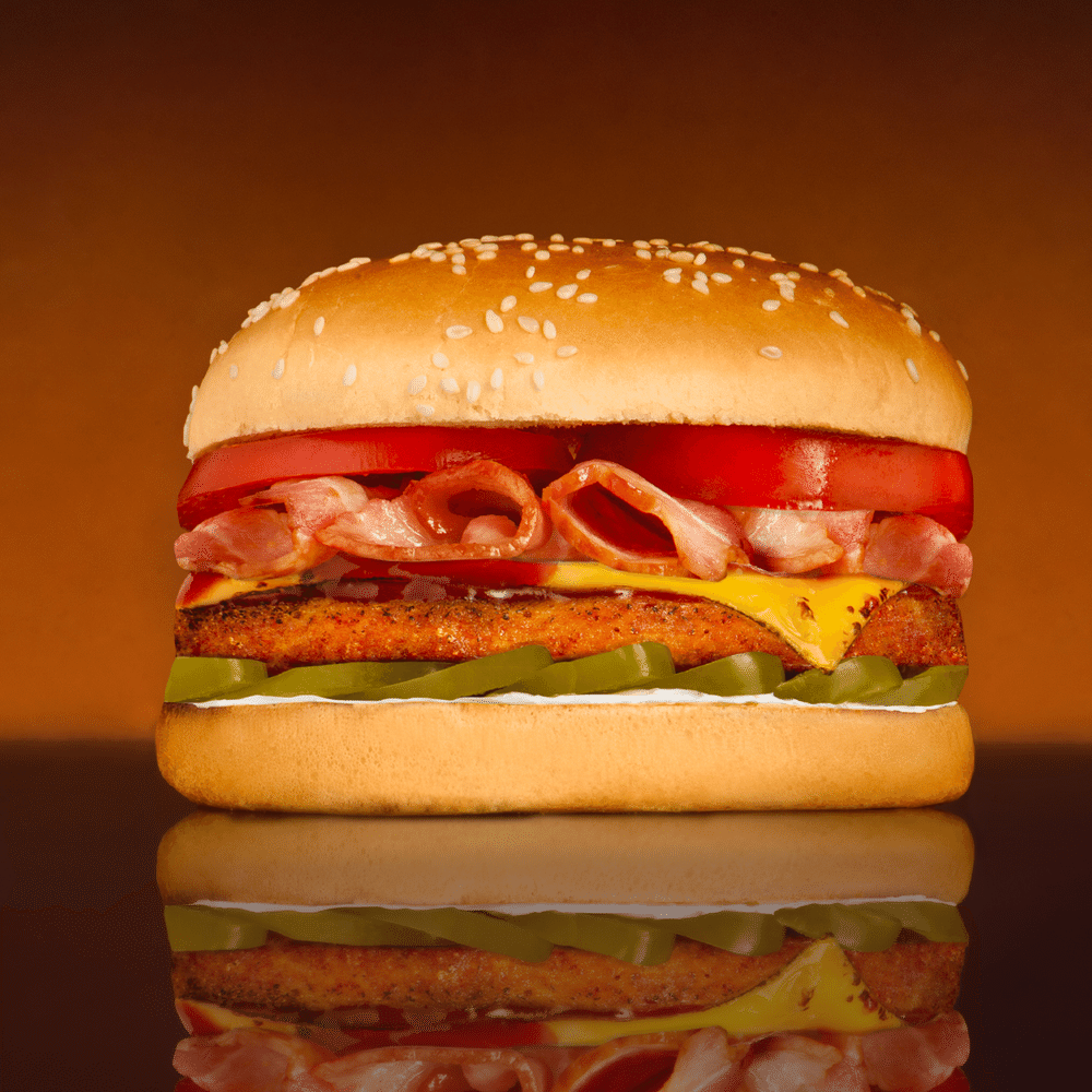 Обжаренная на гриле свежая булочка , ломтик жаренного бекона, перец халапеньо, сыр хохланд, ломтик томатов, куриная котлета.