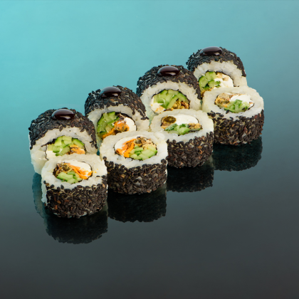 Премиум-ролл со сливочным сыром, нори, авокадо и манго,обернут ломтиками креветки и полит соусом Манго-Чили. Соевый соус приобретается отдельно