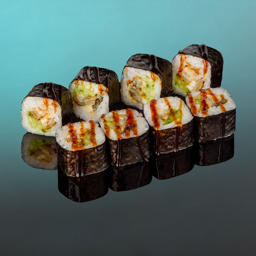 Ролл с угрем и огурцом поливается соусом Унаги. Соевый соус приобретается отдельно.