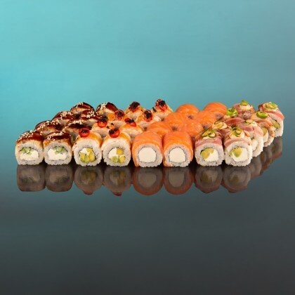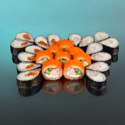 Урамаки Филадельфия Light ; Хосомаки с креветкой ; Хосомаки с огурцом ; Якимаки с лососем ; Урамаки Green Тай ; Double Чиз Темпура. Соевый соус приобретается отдельно