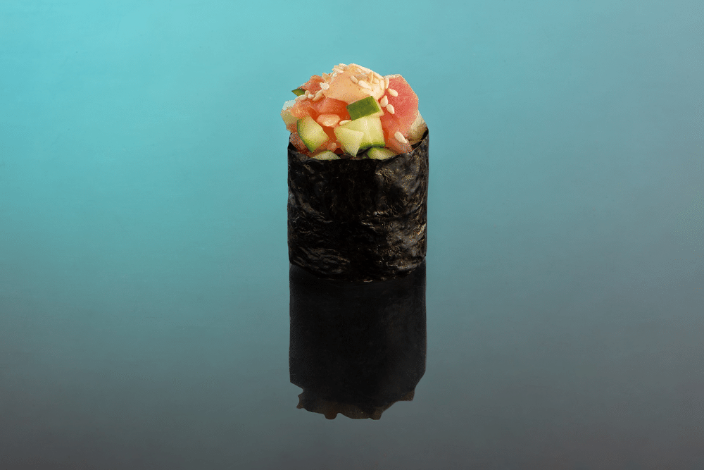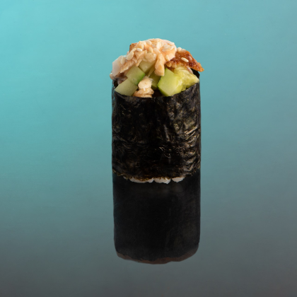 Рис,лосось,свежий огурчик,соус Spicy,нори,посыпается кунжутом.