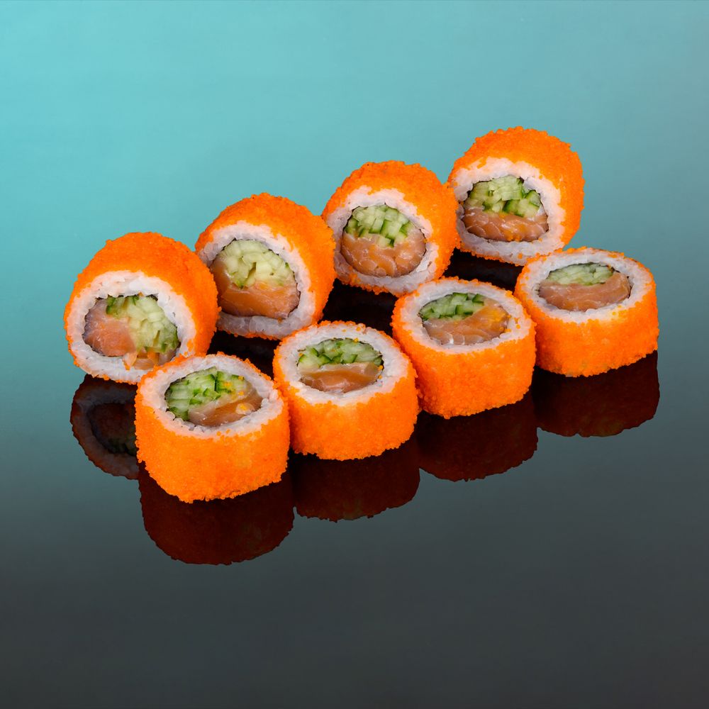 Ролл с лососем , нори и свежем огурчиком , снаружи обсыпан икрой Масаго. Соевый соус приобретается отдельно