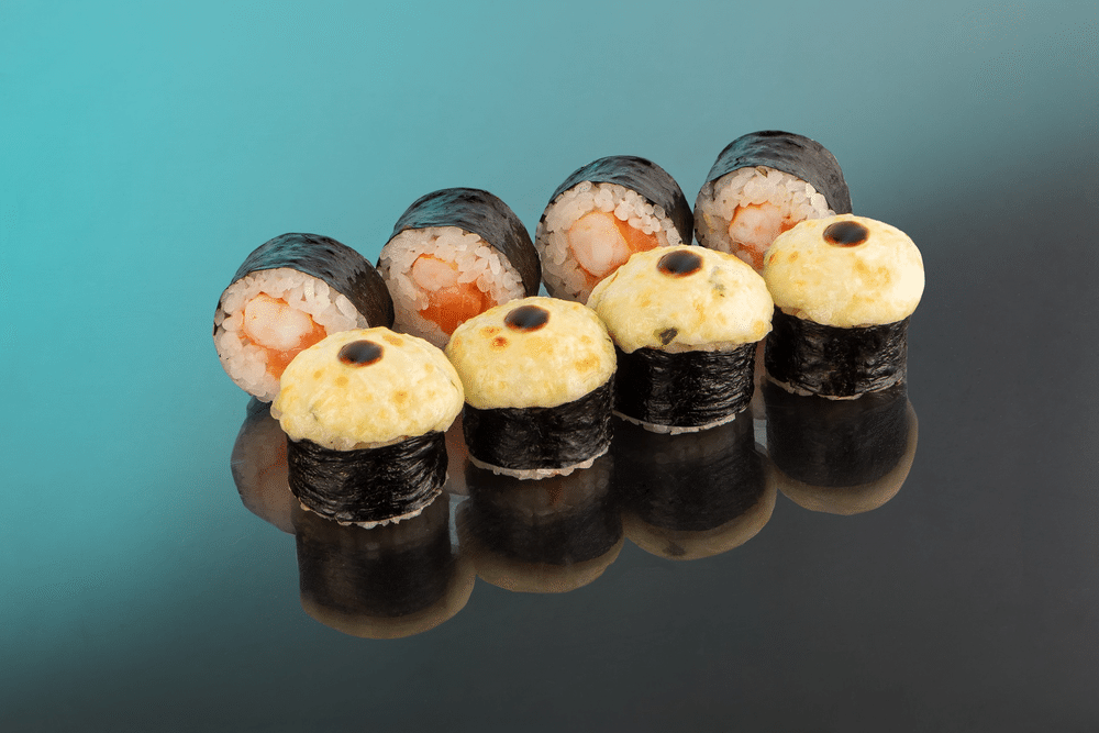 Ролл с креветкой и лососем , запечен под двумя видами сыра, украшается соусом Унаги. Соевый соус приобретается отдельно