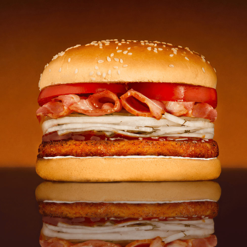 Свежая обжаренная булочка на гриле, ломтик бекона, лук маринованный , ломтик томатов, куриная котлета.