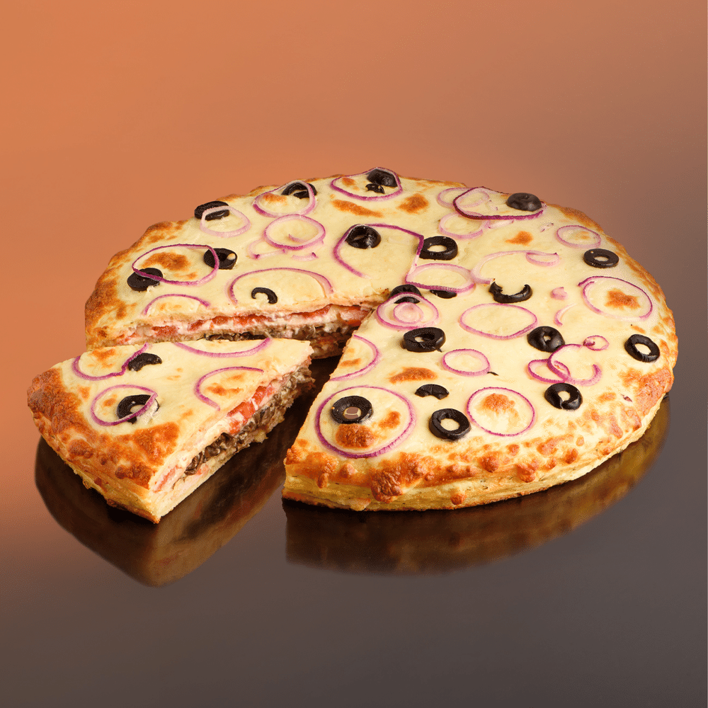 Запеченное куриное филе, жаренные грибы , жаренный репчатый лук , крымский лук, томаты , маслины , сыр моцарелла, фирменный белый соус.