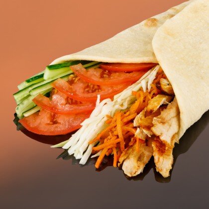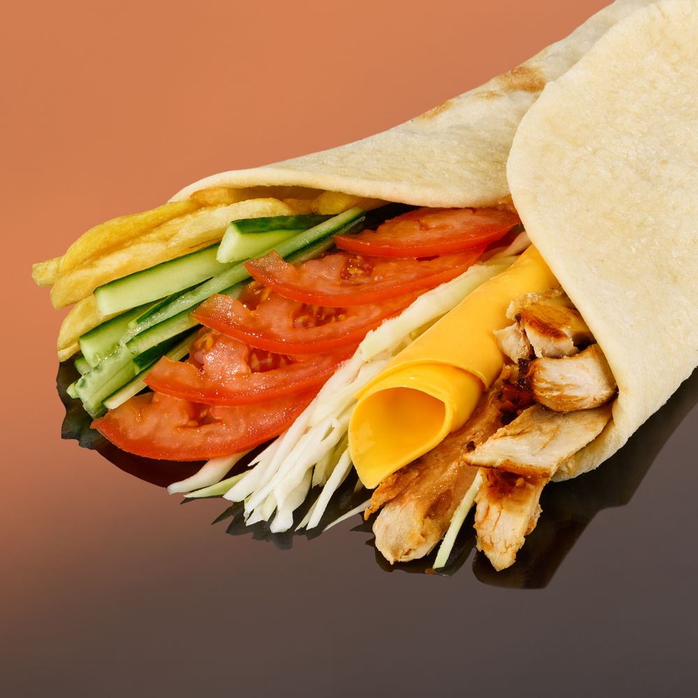 Лаваш, свежая капуста, огурец, томат,картофель фри,тертый сыр, куриное мясо ( соус на выбор)