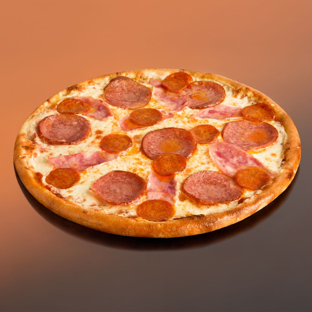 Сервелат , пепперони , ветчина , сыр моцарелла, соус на выбор.