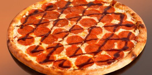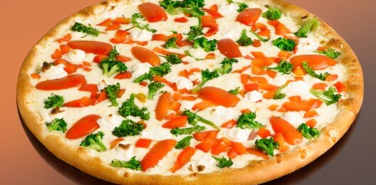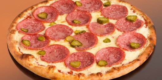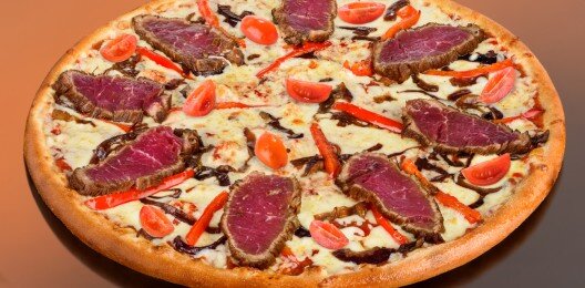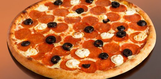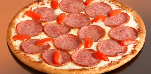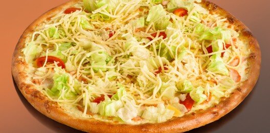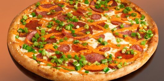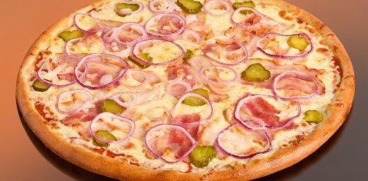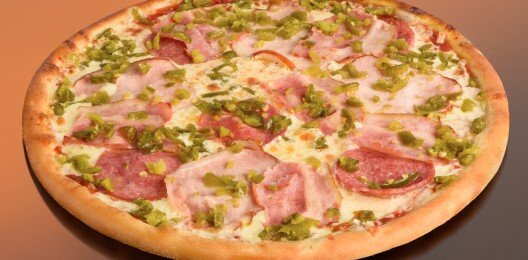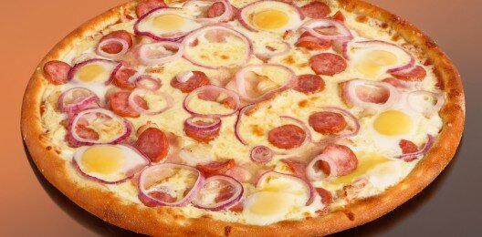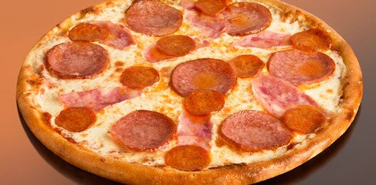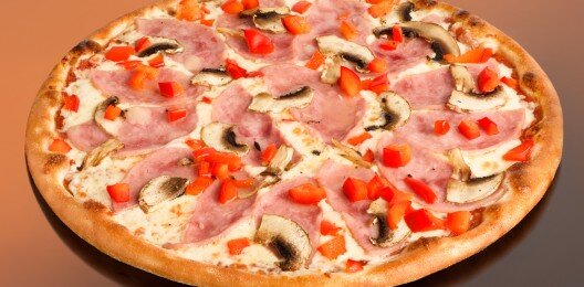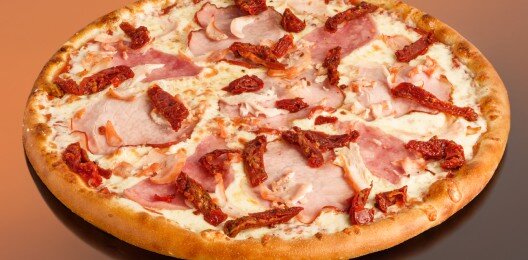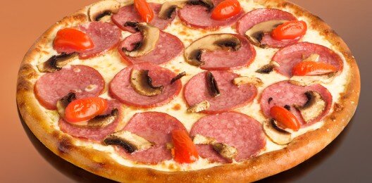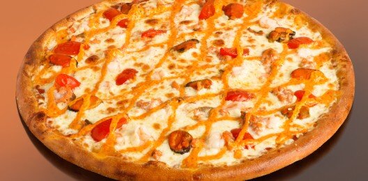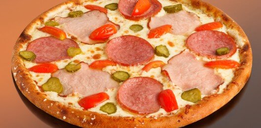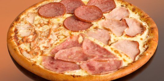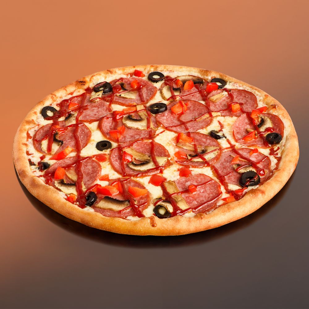 Сервелат, шампиньоны , перец болгарский, маслины , сыр моцарелла, соус на выбор.