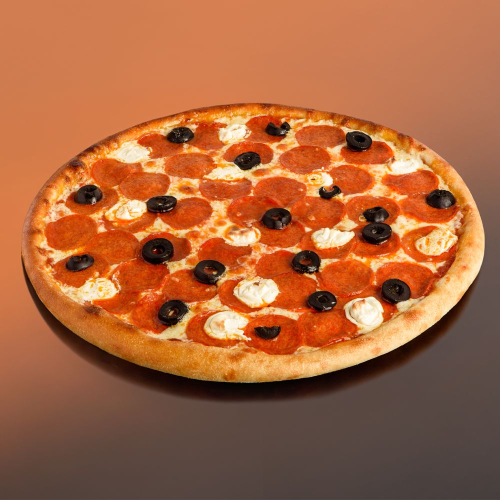 Пепперони, сыр сиртаки , маслины , сыр моцарелла, соус на выбор.