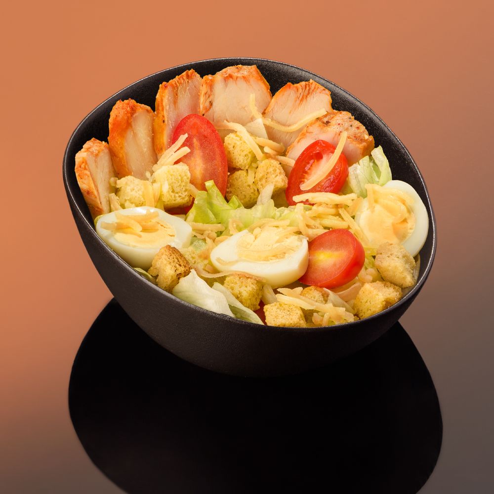 Кусочки куриного филе, салат "Айсберг", черри , яйцо перепелиное ,сыр "Пармезан", фирменные сухарики , соус Цезарь.