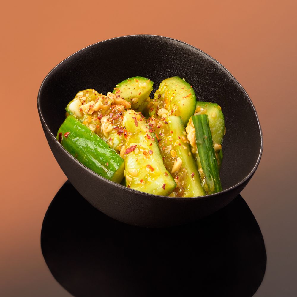 Кусочки свежего огурца , чеснок , хлопья чили, арахис молотый , фирменный маринад.