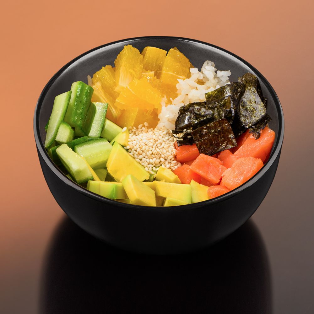 Рис , лосось , свежий огурец , авокадо , кусочки апельсина , нори , кунжут , фирменный соус поке.