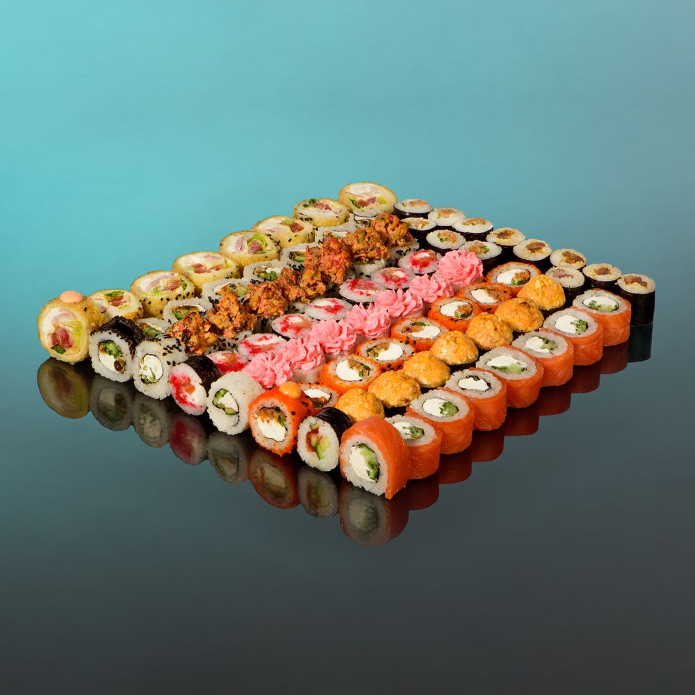 Урамаки Филадельфия Light, Якимаки с Креветкой и Лососем, Урамаки терияки Spicy , Урамаки Лава Краб, Хосомаки Сливочный Лосось, Урамаки Мидии Black , Тортилья Темпура, Хосомаки с Тунцом, Якимаки с Мидией. Соевый соус приобретается отдельно