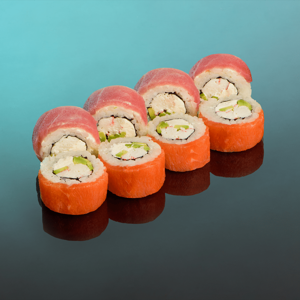 Рис, авокадо , краб , лосось , тунец, нори. Соевый соус приобретается отдельно.