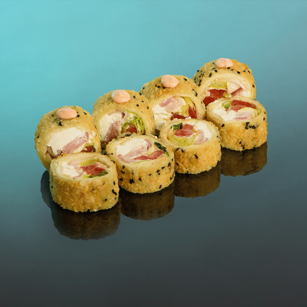 Рис, тортилья , сливочный сыр , бекон , курица жареная , томаты , лист салата "Айсберг" , соус Spicy. Соевый соус приобретается отдельно