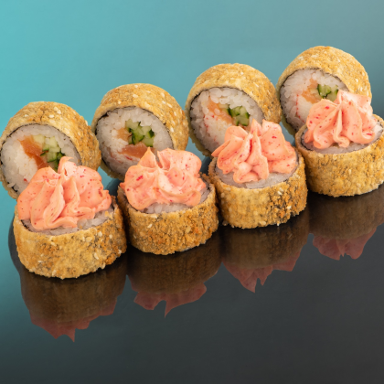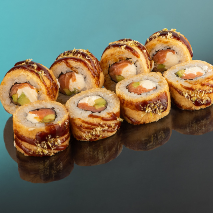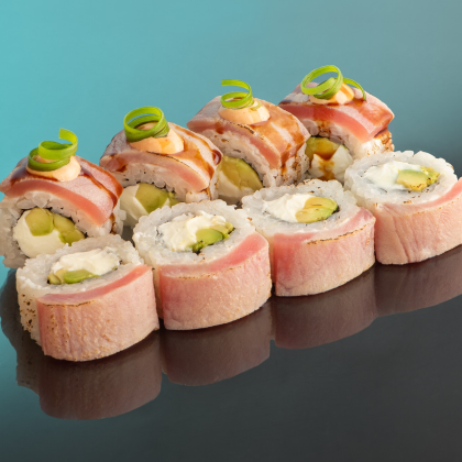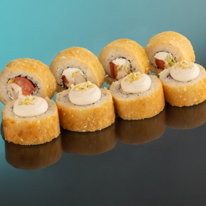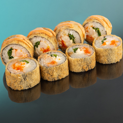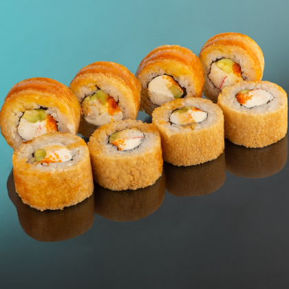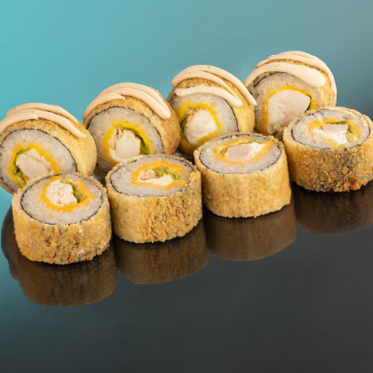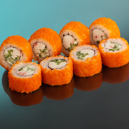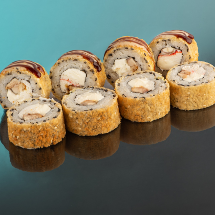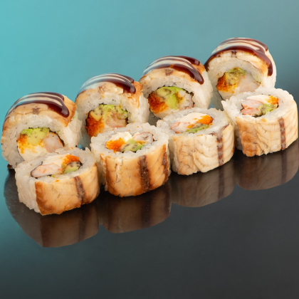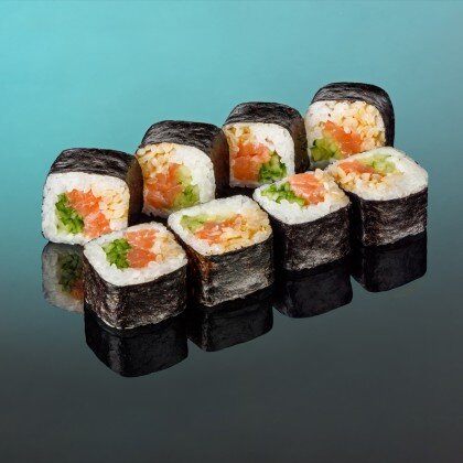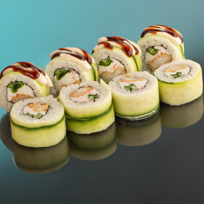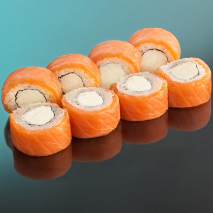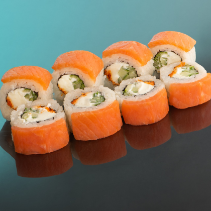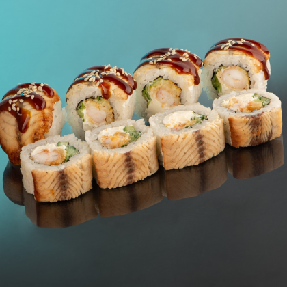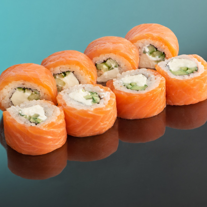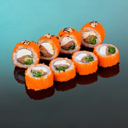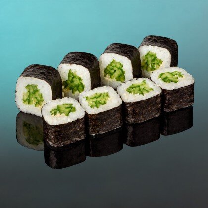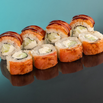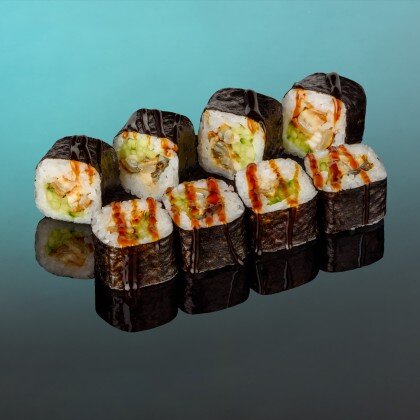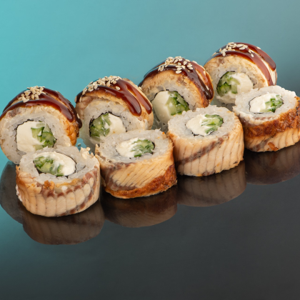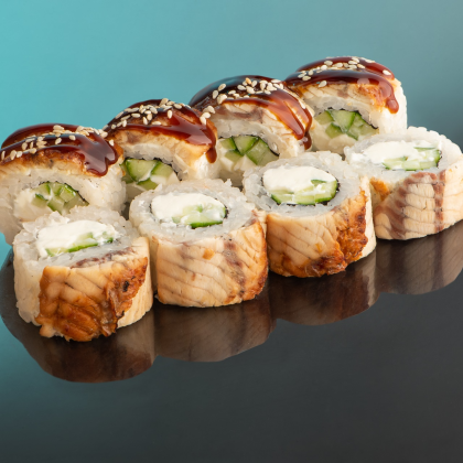 Рис, сливочный сыр , свежий огурец , нори ,шапка мидии , кунжут черный, соус унаги. Соевый соус приобретается отдельно.
