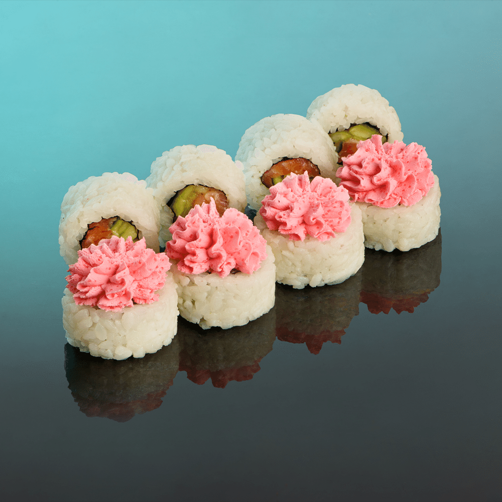 Рис, свежий огурчик , нори , лосось , соус Лава. Соевый соус приобретается отдельно.