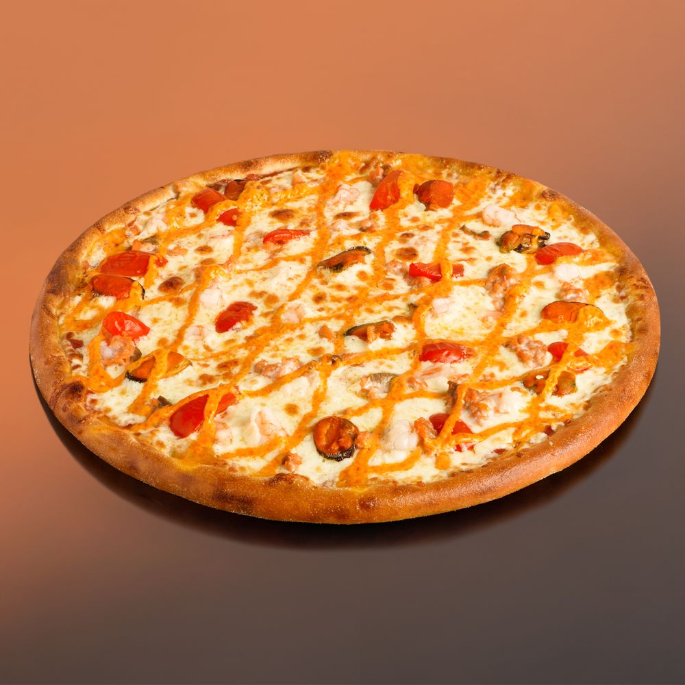 Пицца с мидиями, форелью и креветками,соус на выбор, нежный сыр моцарелла,томаты черри, соус Spicy.