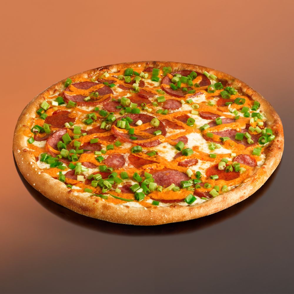 Охотничьи колбаски, сервелат , колбаски пепперони, нежный сыр моцарелла, зеленый лук, соус на выбор, соус Spicy