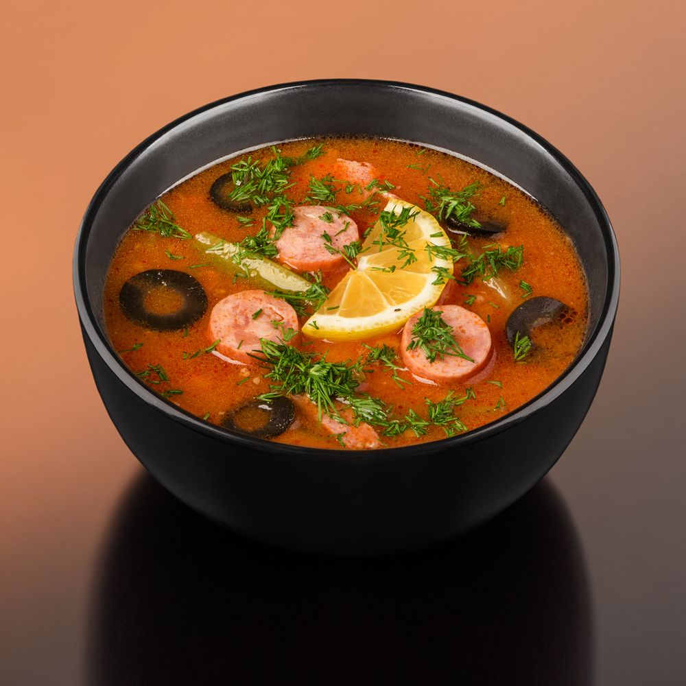 Традиционный русский суп с охотничьими колбасками, сервелатом, ветчиной, солеными огурцами,маслинами.Лимон и сметана подаются отдельно.