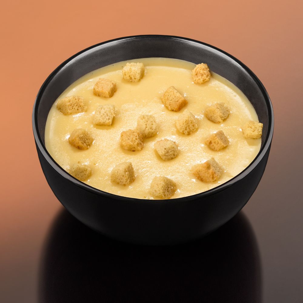 Нежный и сытный суп с копченым сыром,сливками и картофелем.Подается с сухариками отдельно.