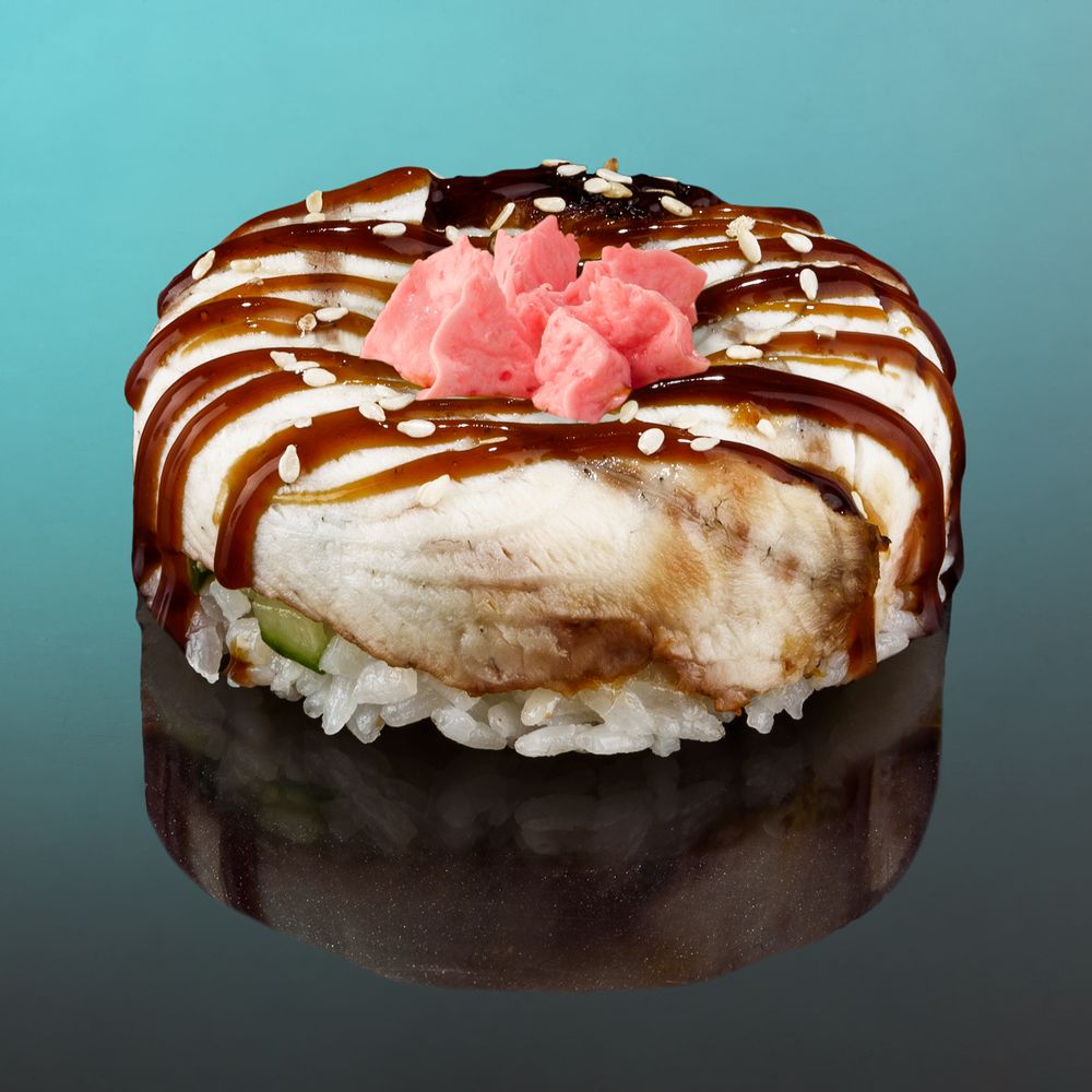 Изысканное сочетание нежного угря, риса для суши и свежего огурчика, поданное в форме пончика. Идеален для романтического ужина или вечеринки. Соевый соус приобретается отдельно.