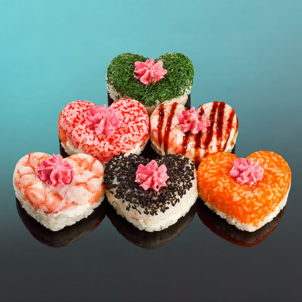 Сердечко-Пончик "Креветка Унаги", Сердечко-Пончик "Креветка" , Сердечко-Пончик "Кунжут" , Сердечко-Пончик "Масаго" , Сердечко-Пончик "С Укропом" , Сердечко-Пончик "Калифорния" . Соевый соус приобретается отдельно.