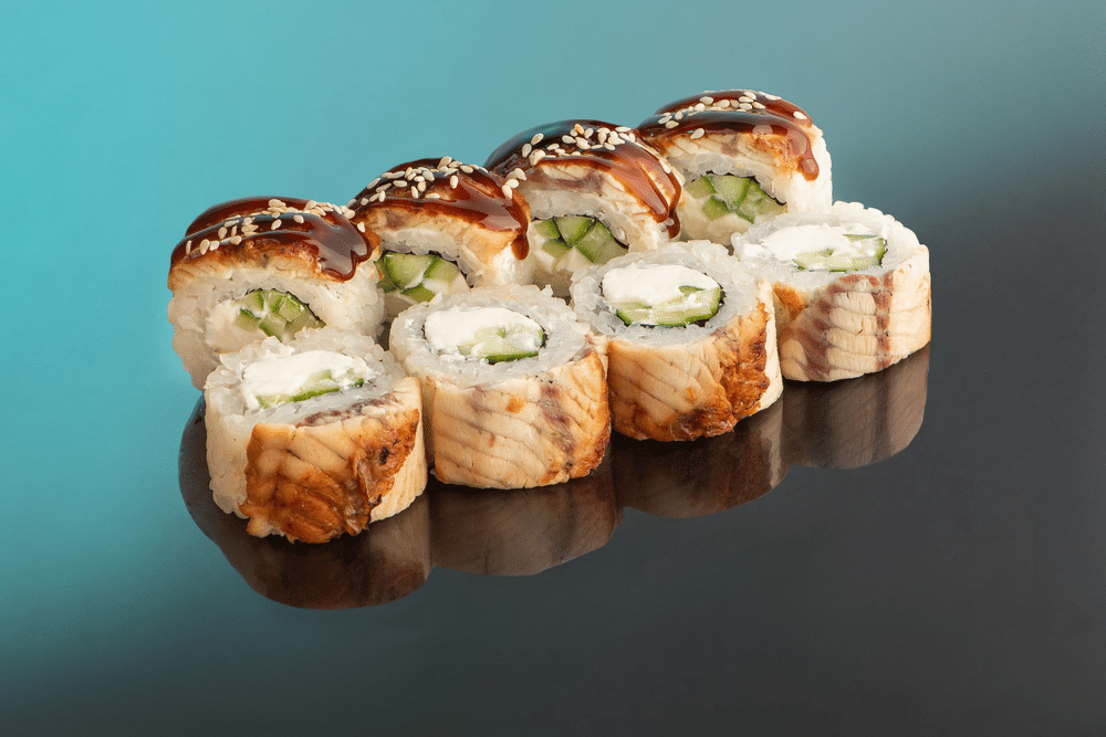 Ролл со сливочным сыром,свежим огурчиком, копченным угрем , поливается соусом Унаги и посыпается белым кунжутом. Возможно попадание мелких косточек в угре!Соевый соус приобретается отдельно
