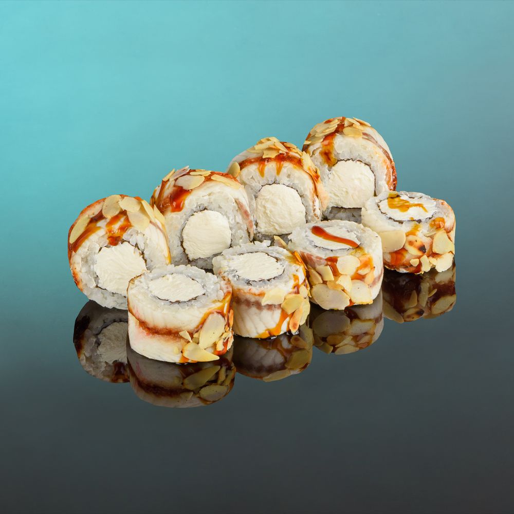 Рис,сливочный сыр, Угорь,миндаль жареный,соус Унаги. Соевый соус продается отдельно.