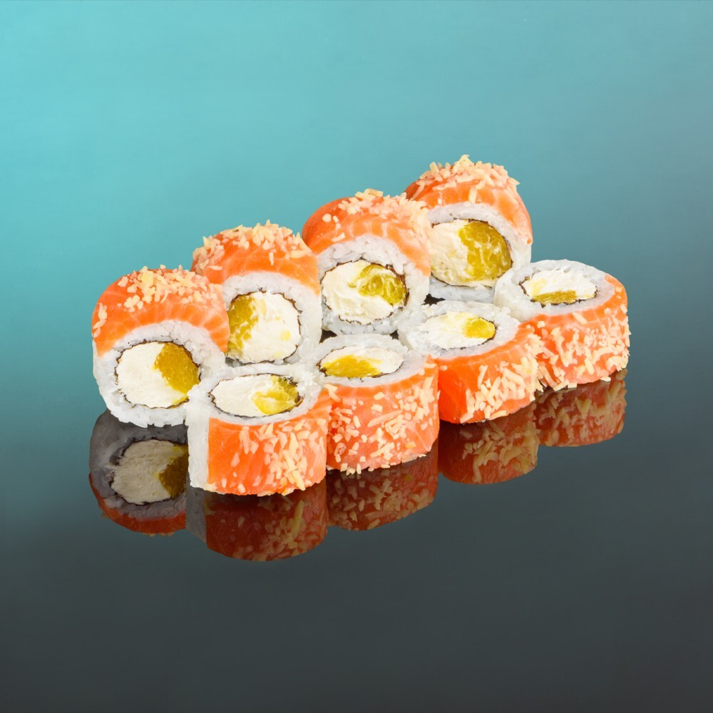 Рис, сливочный сыр, апельсин, лосось, сыр "Пармезан". Соевый соус продается отдельно.